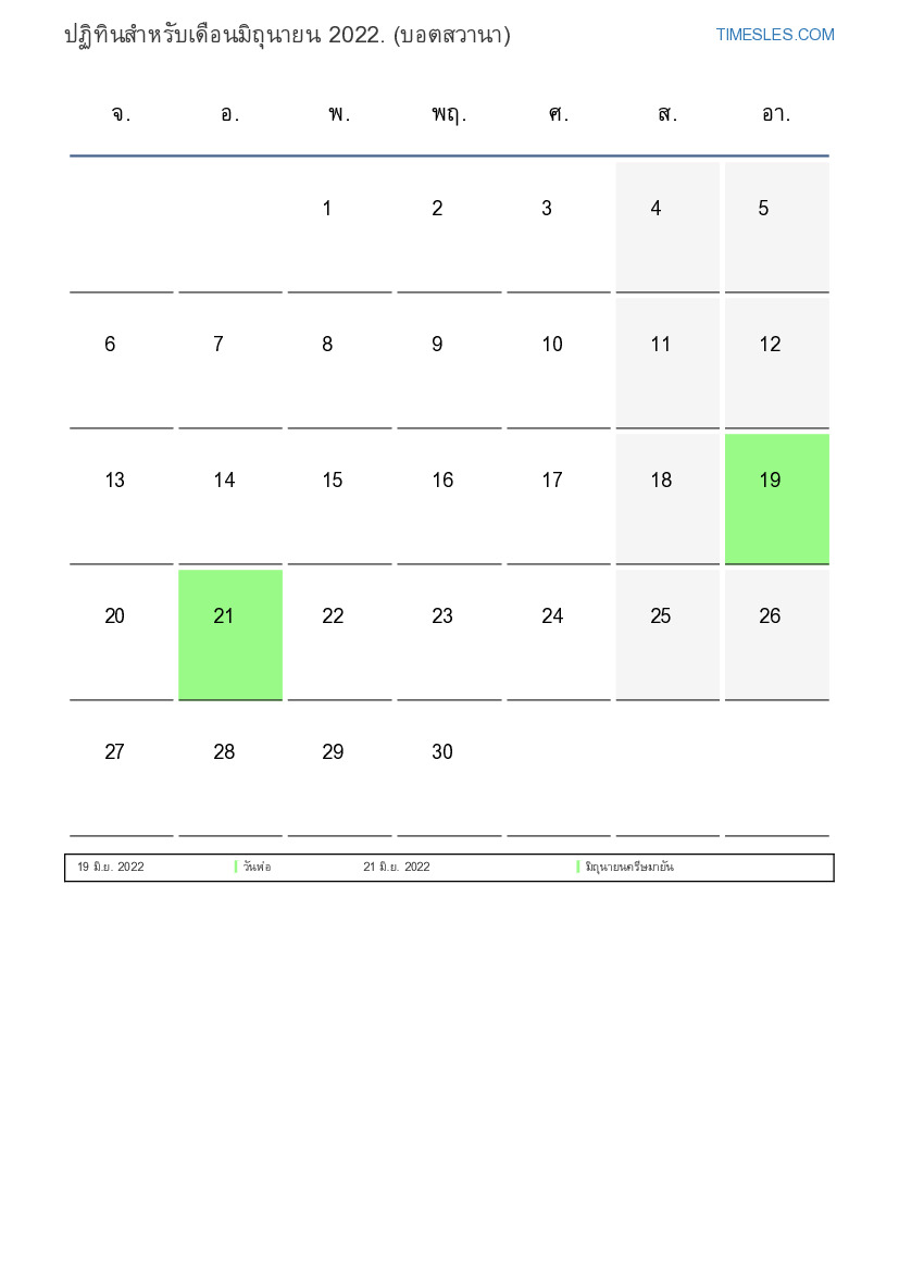 เดือนมิถุนายนมี 30 วัน วัน นี่คือ 6 เดือนของปี 2022 ฤดูกาลของปี: ฤดูร้อน เดือนมิถุนายนเริ่มในวันพุธและสิ้นสุดในวันพฤหัสบดีที่ ในเดือนมิถุนายน 2022 มี2 วันหยุดและวันหยุดในบอตสวานา