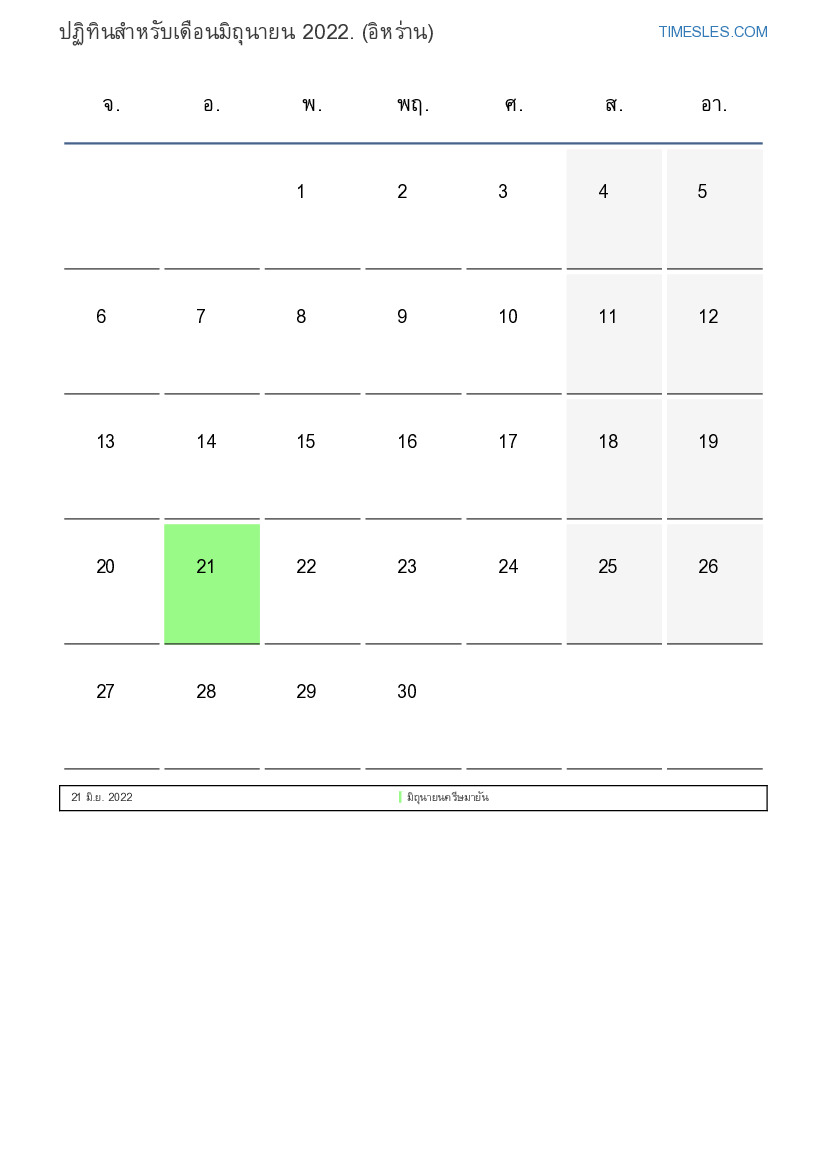 ดาวน์โหลดและพิมพ์ปฏิทิน PDF พร้อมวันหยุดและวันหยุดสุดสัปดาห์สำหรับเดือนมิถุนายน 2022 สำหรับอิหร่าน