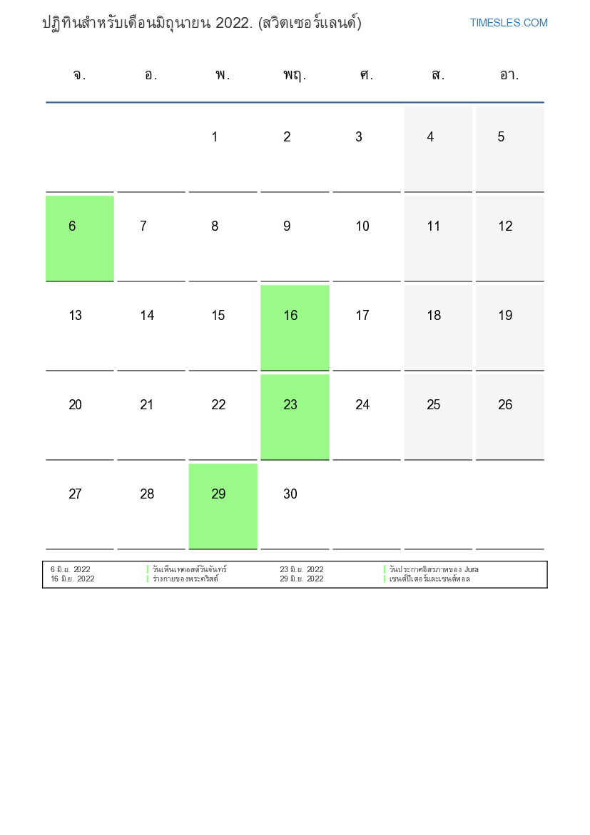 ปฏิทินวันหยุดและวันหยุดสุดสัปดาห์มิถุนายน 2022 สำหรับสวิตเซอร์แลนด์