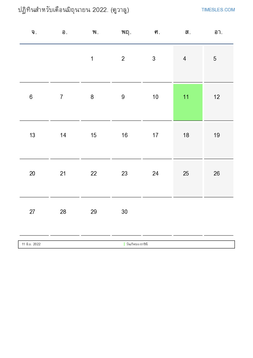 เดือนมิถุนายนมี 30 วัน วัน นี่คือ 6 เดือนของปี 2022 ฤดูกาลของปี: ฤดูร้อน เดือนมิถุนายนเริ่มในวันพุธและสิ้นสุดในวันพฤหัสบดีที่ ในเดือนมิถุนายน 2022 มี2 วันหยุดและวันหยุดในตูวาลู