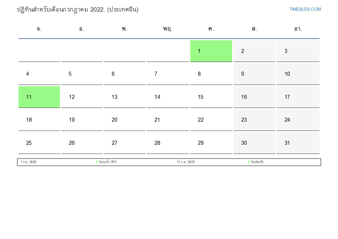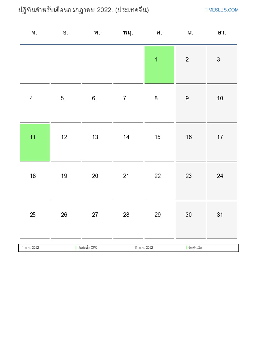 ปฏิทินวันหยุดและวันหยุดสุดสัปดาห์กรกฎาคม 2022 สำหรับประเทศจีน