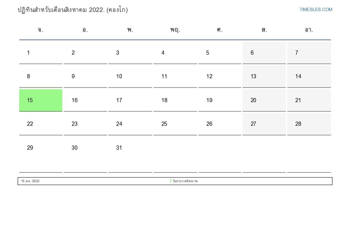 เดือนสิงหาคมมี 31 วัน วัน นี่คือ 8 เดือนของปี 2022 ฤดูกาลของปี: ฤดูร้อน เดือนสิงหาคมเริ่มในวันจันทร์และสิ้นสุดในวันพุธ ในเดือนสิงหาคม 2022 มี1 วันหยุดและวันหยุดในคองโก