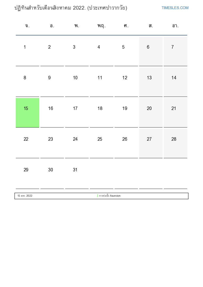 ปฏิทินเดือนสิงหาคม 2022 สำหรับปารากวัย