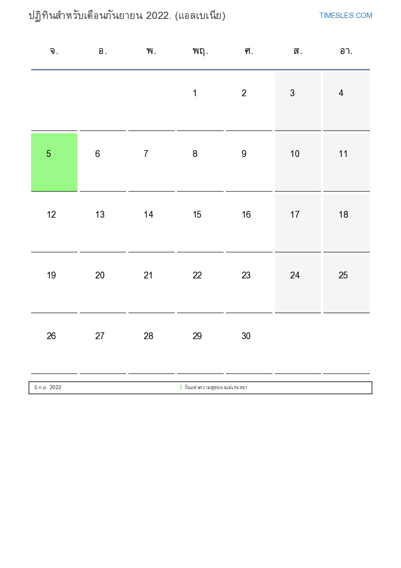 เดือนกันยายนมี 30 วัน วัน นี่คือ 9 เดือนของปี 2022 ฤดูกาลของปี: ฤดูใบไม้ร่วง เดือนกันยายนเริ่มในวันพฤหัสบดีที่และสิ้นสุดในวันศุกร์ ในเดือนกันยายน 2022 มี2 วันหยุดและวันหยุดในอัลบานี