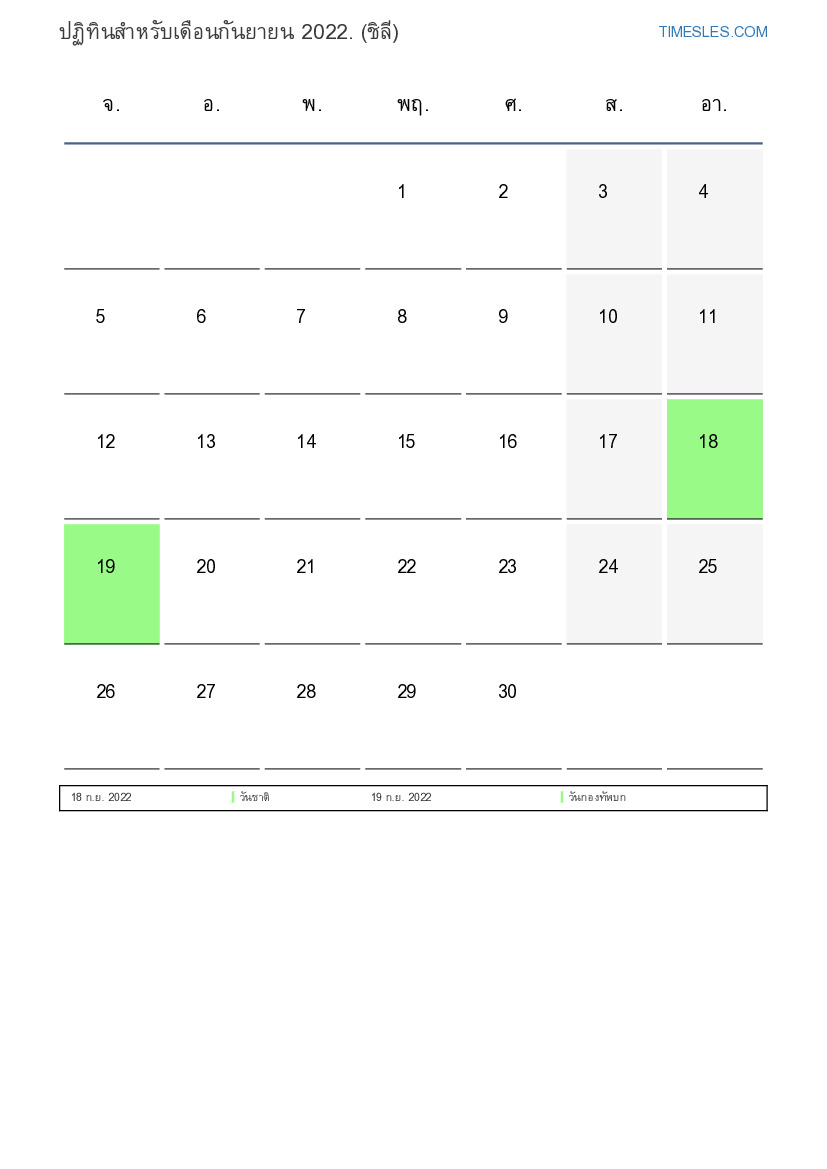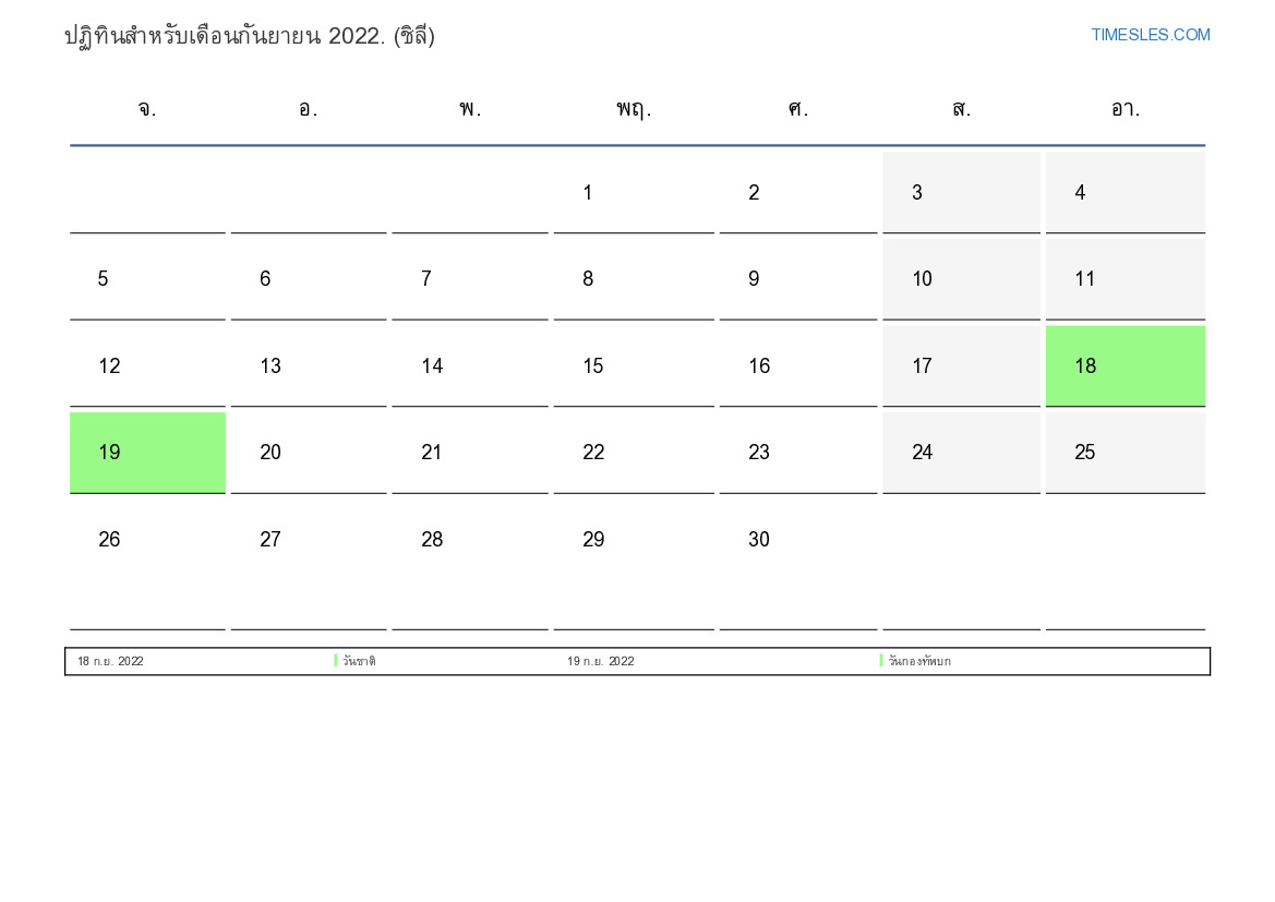 ดาวน์โหลดและพิมพ์ปฏิทิน PDF พร้อมวันหยุดและวันหยุดสุดสัปดาห์สำหรับเดือนกันยายน 2022 สำหรับชิลี