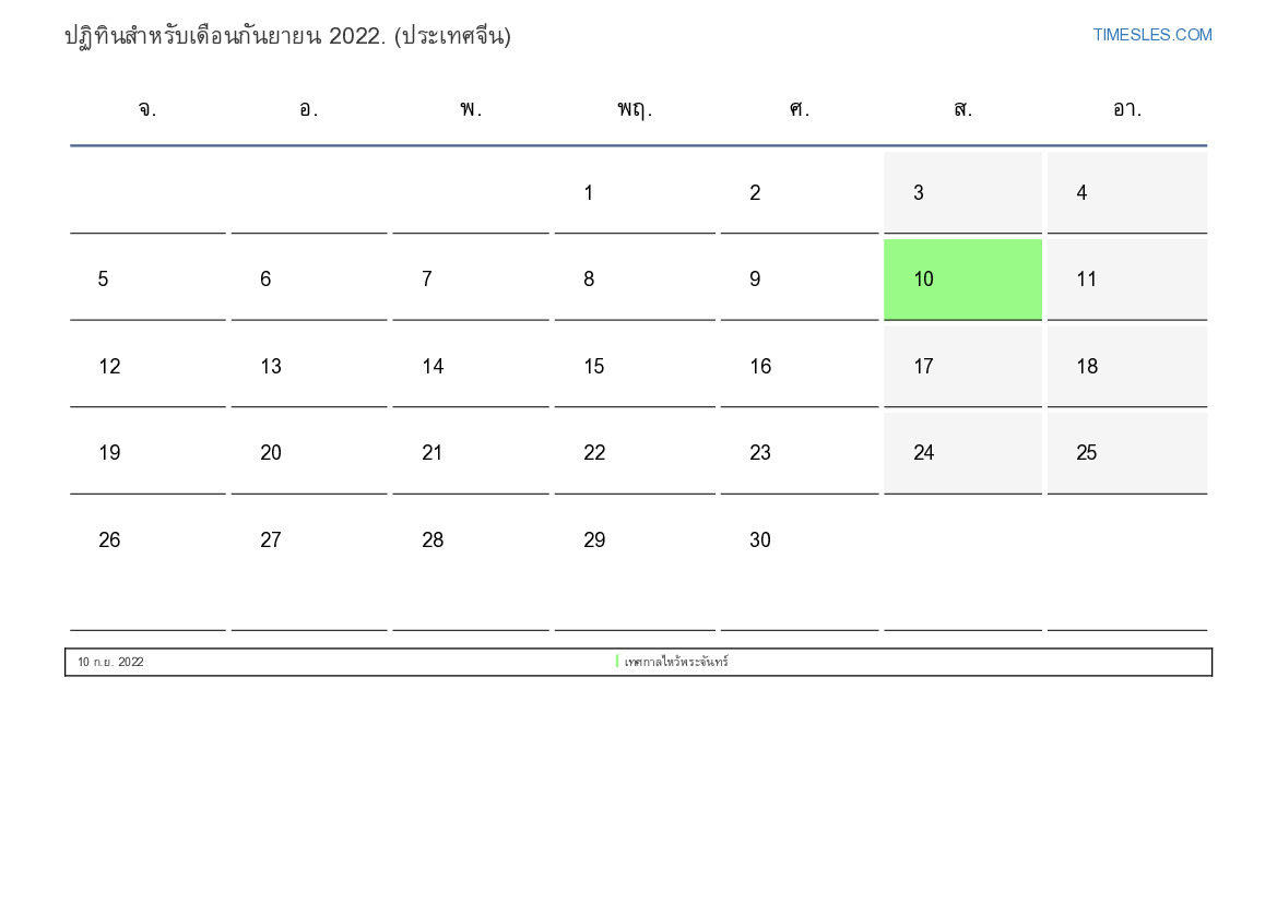 ดาวน์โหลดและพิมพ์ปฏิทิน PDF พร้อมวันหยุดและวันหยุดสุดสัปดาห์สำหรับเดือนกันยายน 2022 สำหรับประเทศจีน