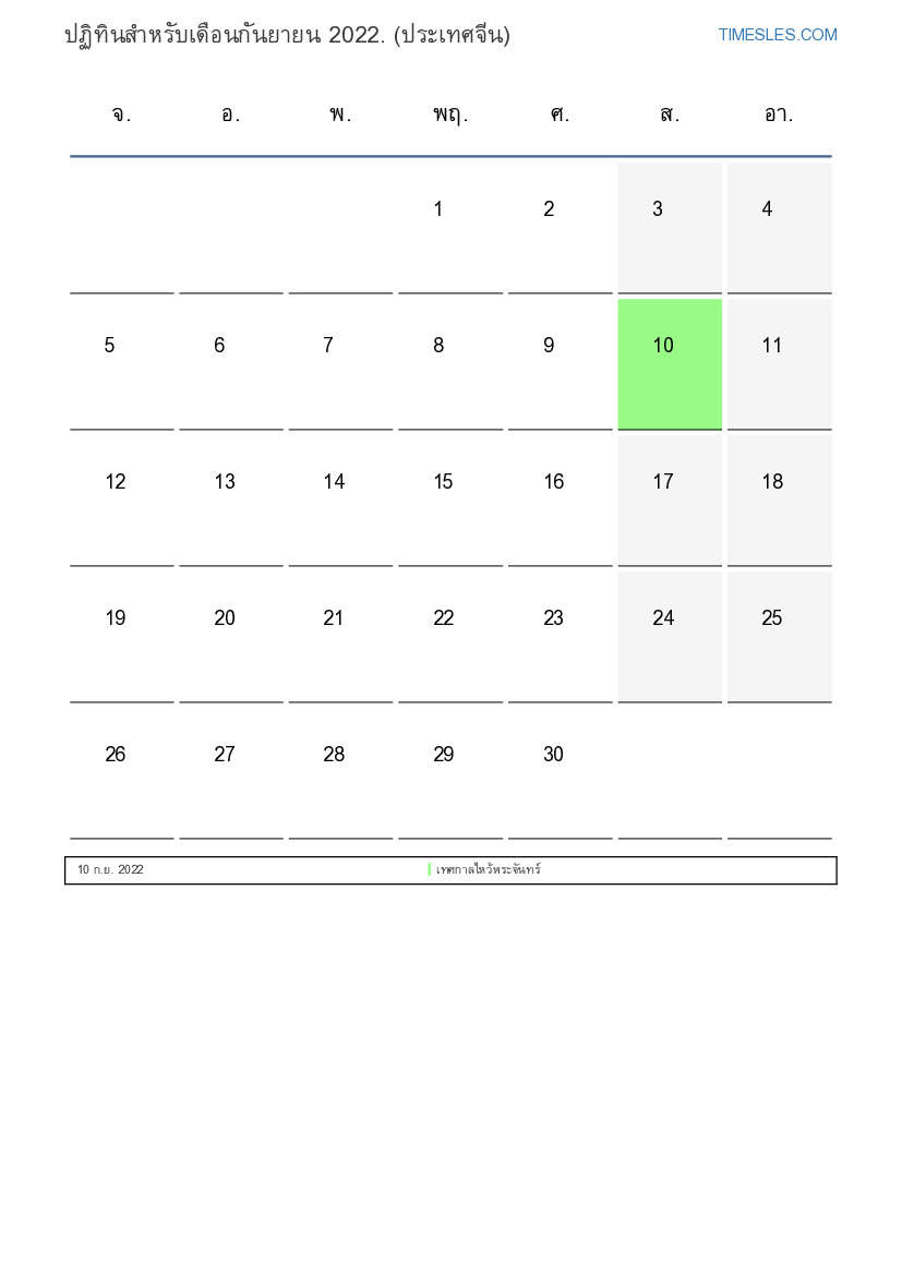 ปฏิทินเดือนกันยายน 2022 สำหรับประเทศจีน