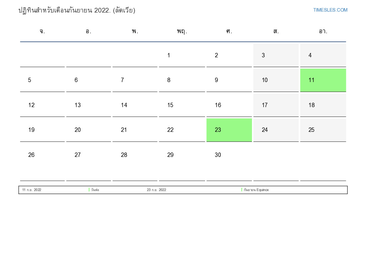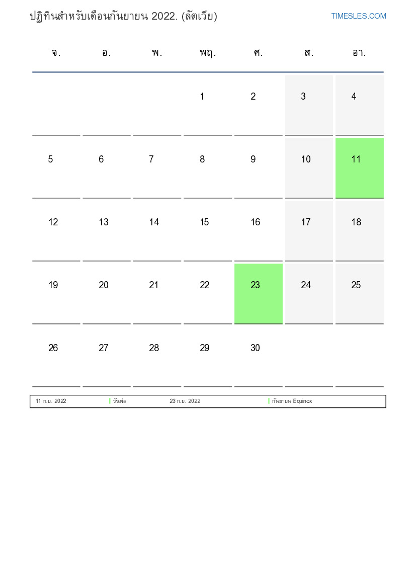 เดือนกันยายนมี 30 วัน วัน นี่คือ 9 เดือนของปี 2022 ฤดูกาลของปี: ฤดูใบไม้ร่วง เดือนกันยายนเริ่มในวันพฤหัสบดีที่และสิ้นสุดในวันศุกร์ ในเดือนกันยายน 2022 มี2 วันหยุดและวันหยุดในลัตเวีย
