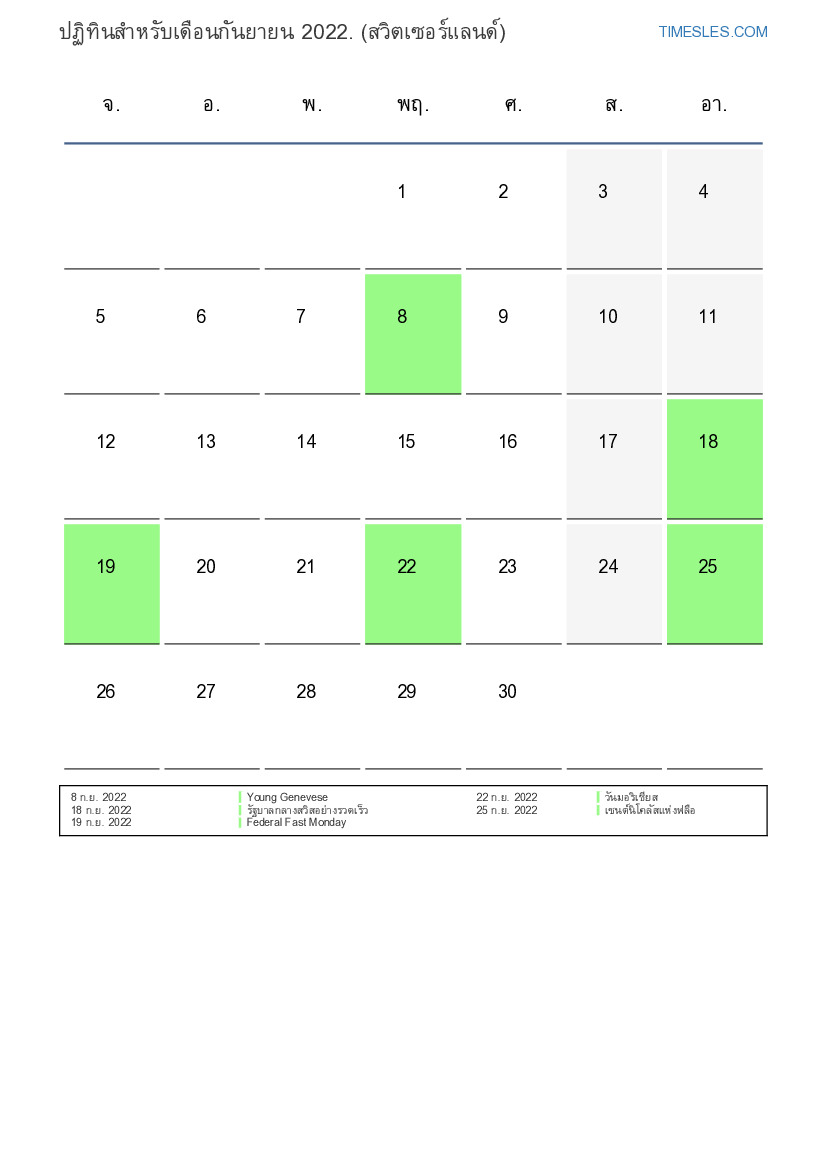 ปฏิทินวันหยุดและวันหยุดสุดสัปดาห์กันยายน 2022 สำหรับสวิตเซอร์แลนด์