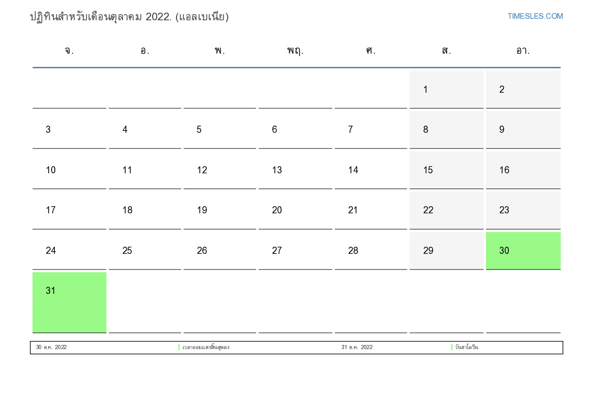 เดือนตุลาคมมี 31 วัน วัน นี่คือ 10 เดือนของปี 2022 ฤดูกาลของปี: ฤดูใบไม้ร่วง เดือนตุลาคมเริ่มวันเสาร์และสิ้นสุดในวันจันทร์ ในเดือนตุลาคม 2022 มี2 วันหยุดและวันหยุดในอัลบานี