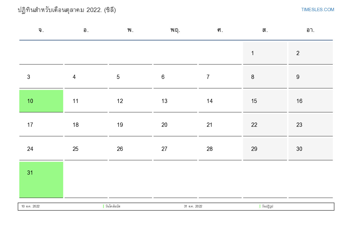 ปฏิทินเดือนตุลาคม 2022 สำหรับชิลี