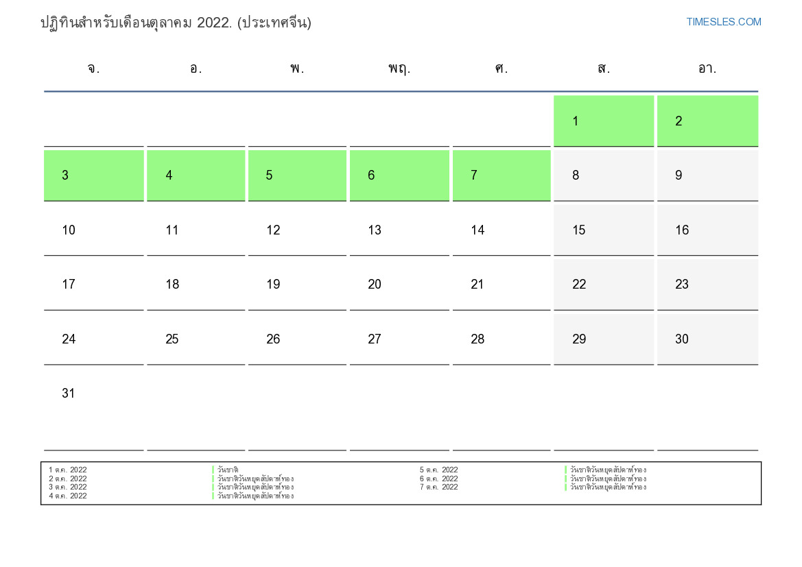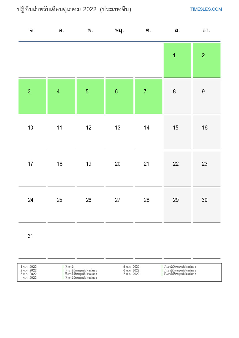 ดาวน์โหลดและพิมพ์ปฏิทิน PDF พร้อมวันหยุดและวันหยุดสุดสัปดาห์สำหรับเดือนตุลาคม 2022 สำหรับประเทศจีน