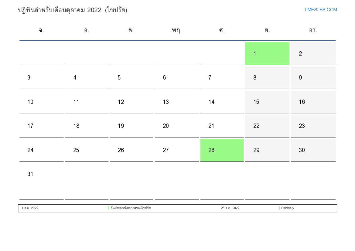 ปฏิทินวันหยุดและวันหยุดสุดสัปดาห์ตุลาคม 2022 สำหรับไซปรัส