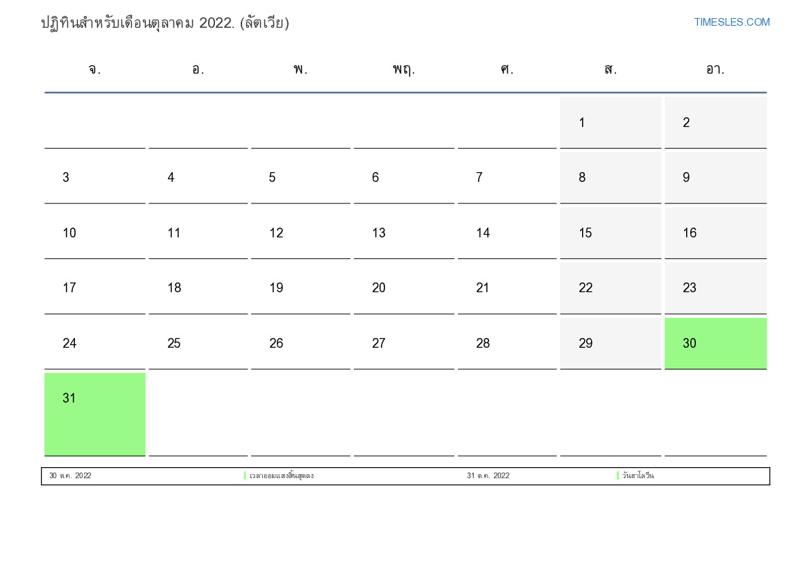 ดาวน์โหลดและพิมพ์ปฏิทิน PDF พร้อมวันหยุดและวันหยุดสุดสัปดาห์สำหรับเดือนตุลาคม 2022 สำหรับลัตเวีย