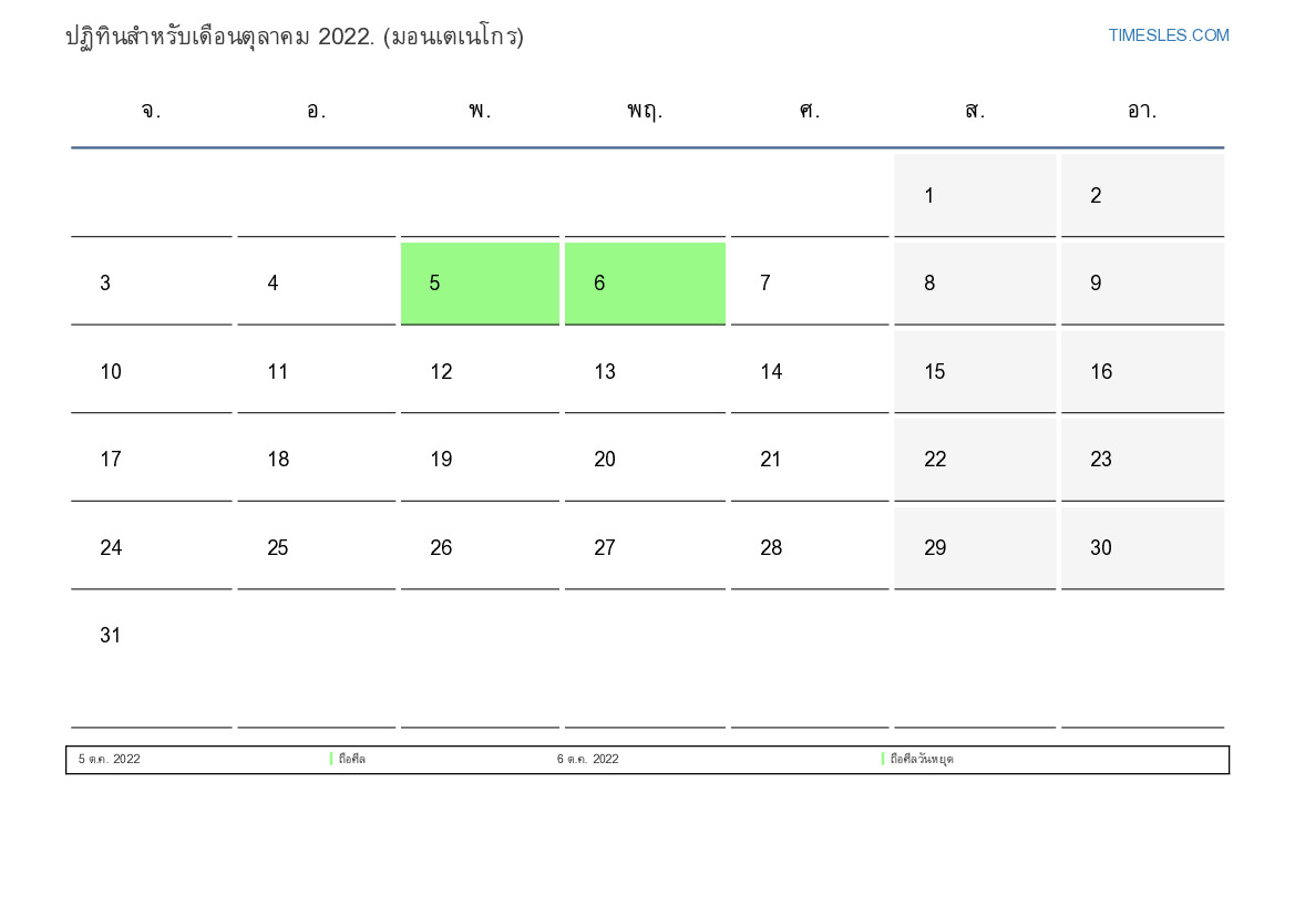 ดาวน์โหลดและพิมพ์ปฏิทิน PDF พร้อมวันหยุดและวันหยุดสุดสัปดาห์สำหรับเดือนตุลาคม 2022 สำหรับมอนเตเนโกร