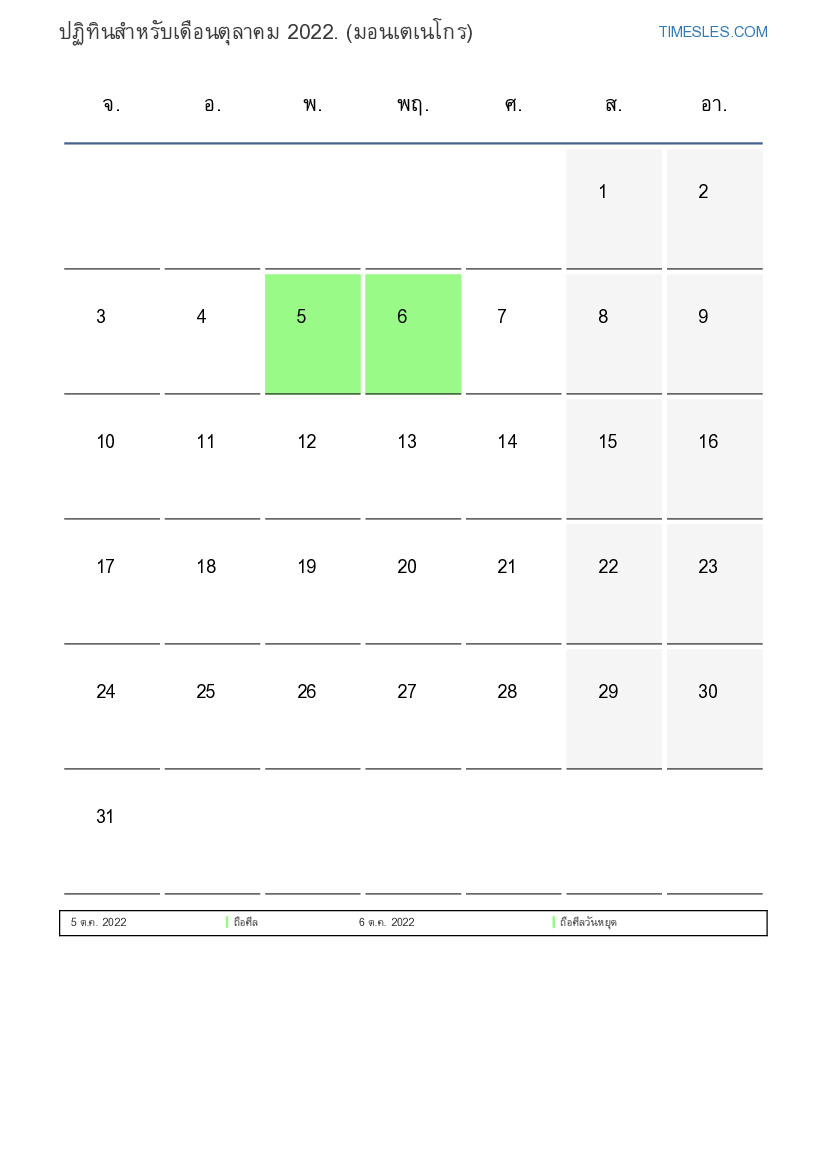 เดือนตุลาคมมี 31 วัน วัน นี่คือ 10 เดือนของปี 2022 ฤดูกาลของปี: ฤดูใบไม้ร่วง เดือนตุลาคมเริ่มวันเสาร์และสิ้นสุดในวันจันทร์ ในเดือนตุลาคม 2022 มี2 วันหยุดและวันหยุดในมอนเตเนโกร