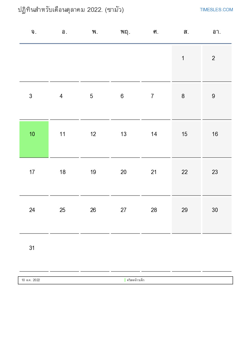 เดือนตุลาคมมี 31 วัน วัน นี่คือ 10 เดือนของปี 2022 ฤดูกาลของปี: ฤดูใบไม้ร่วง เดือนตุลาคมเริ่มวันเสาร์และสิ้นสุดในวันจันทร์ ในเดือนตุลาคม 2022 มี1 วันหยุดและวันหยุดในซามัว