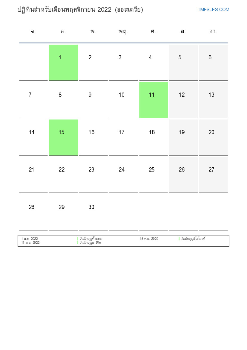 ปฏิทินวันหยุดและวันหยุดสุดสัปดาห์พฤศจิกายน 2022 สำหรับออสเตรีย