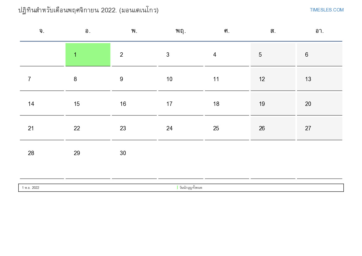 เดือนพฤศจิกายนมี 30 วัน วัน นี่คือ 11 เดือนของปี 2022 ฤดูกาลของปี: ฤดูใบไม้ร่วง เดือนพฤศจิกายนเริ่มในวันอังคารและสิ้นสุดในวันพุธ ในเดือนพฤศจิกายน 2022 มี1 วันหยุดและวันหยุดในมอนเตเนโกร