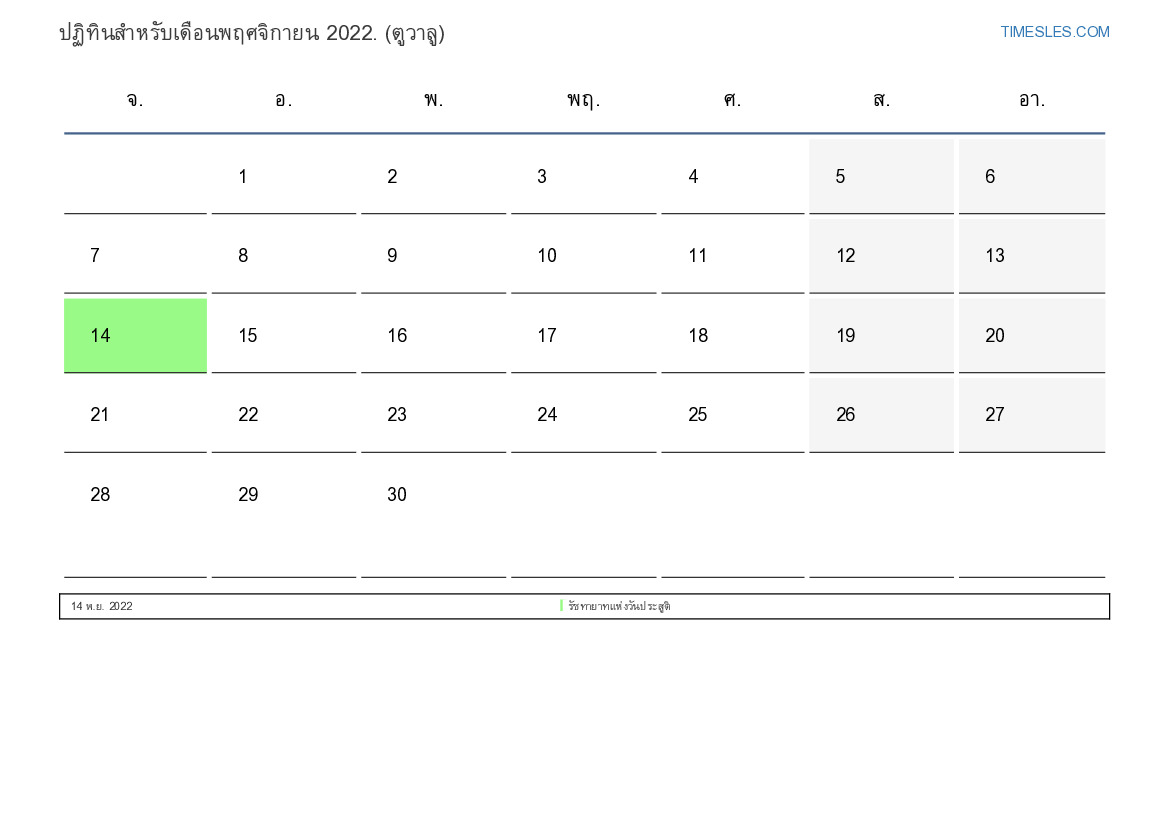 เดือนพฤศจิกายนมี 30 วัน วัน นี่คือ 11 เดือนของปี 2022 ฤดูกาลของปี: ฤดูใบไม้ร่วง เดือนพฤศจิกายนเริ่มในวันอังคารและสิ้นสุดในวันพุธ ในเดือนพฤศจิกายน 2022 มี1 วันหยุดและวันหยุดในตูวาลู