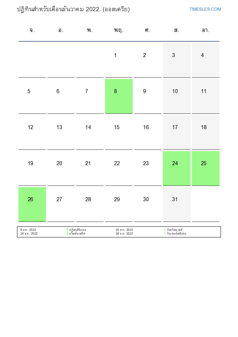 ปฏิทินวันหยุดและวันหยุดสุดสัปดาห์ธันวาคม 2022 สำหรับออสเตรีย