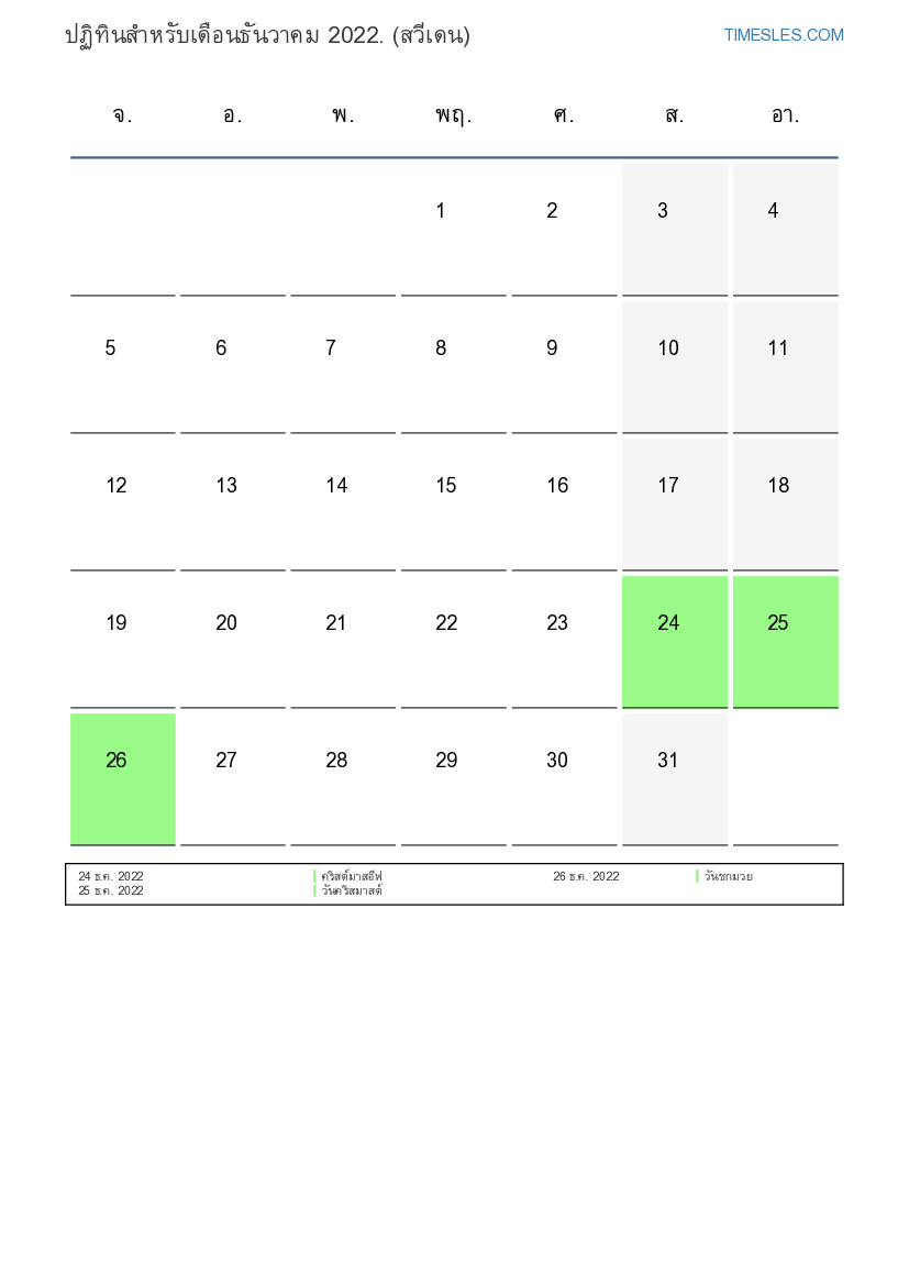 ปฏิทินวันหยุดและวันหยุดสุดสัปดาห์ธันวาคม 2022 สำหรับสวีเดน