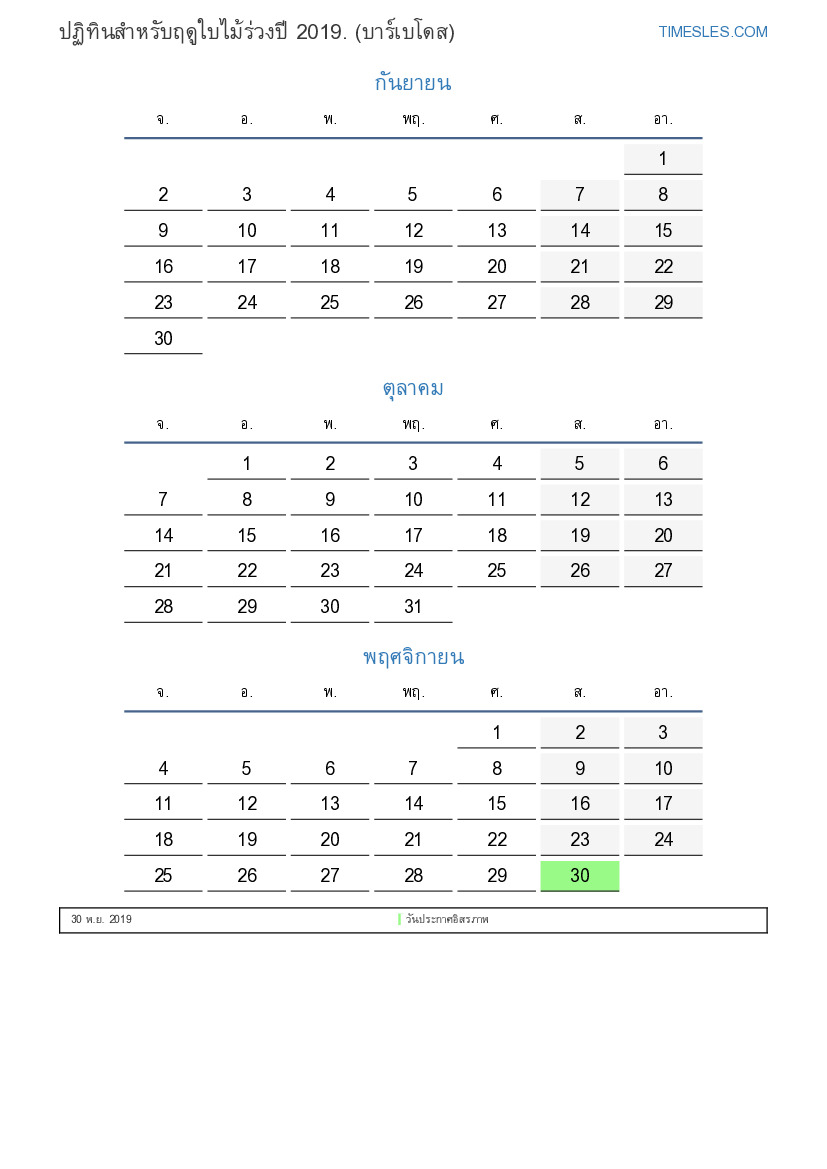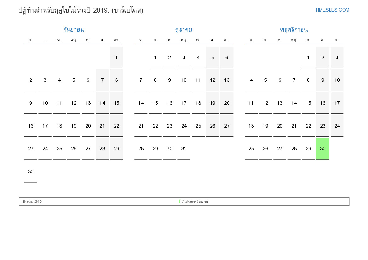 ดาวน์โหลดและพิมพ์ปฏิทิน PDF พร้อมวันหยุดและวันหยุดสุดสัปดาห์สำหรับฤดูใบไม้ร่วงปี 2019 สำหรับบาร์เบโดส
