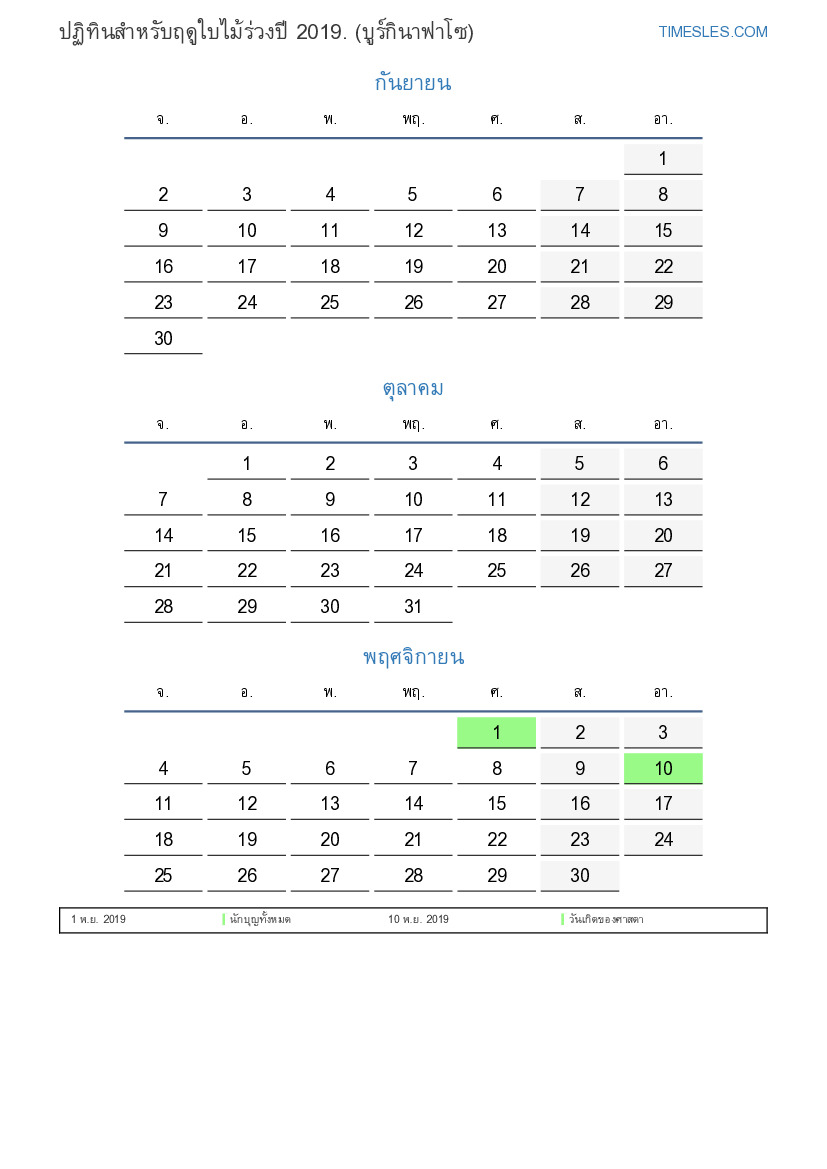 ในฤดูใบไม้ร่วง 2019 ในบูร์กินาฟาโซมีวันหยุด 3 วันหยุดและวันหยุด ฤดูใบไม้ร่วงปี 2019 เริ่มในวันอาทิตย์และสิ้นสุดวันเสาร์