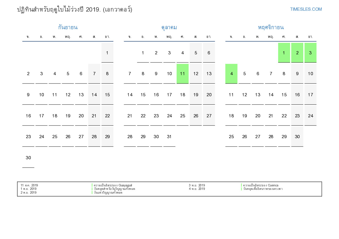 ปฏิทินวันหยุดและวันหยุดสุดสัปดาห์สำหรับฤดูใบไม้ร่วงปี 2019 สำหรับเอกวาดอร์