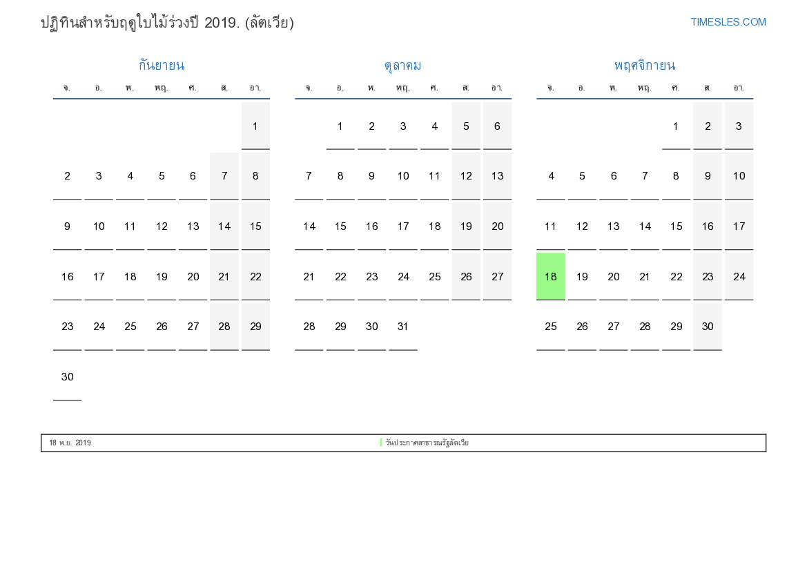 ปฏิทินสำหรับฤดูใบไม้ร่วงปี 2019 สำหรับลัตเวีย
