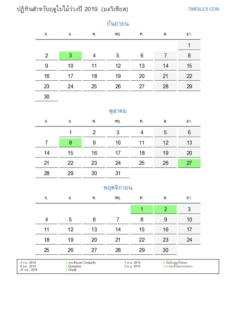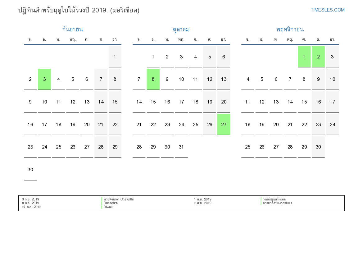 ปฏิทินสำหรับฤดูใบไม้ร่วงปี 2019 สำหรับมอริเชียส
