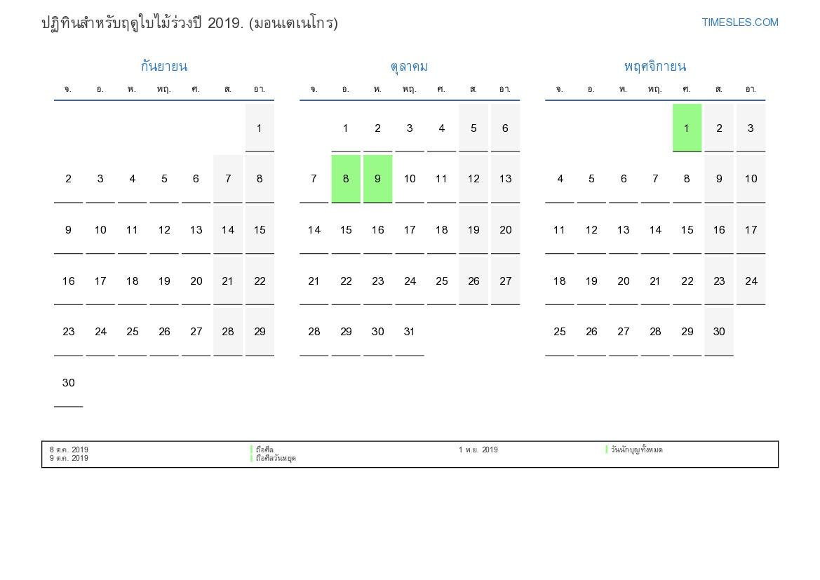 ปฏิทินสำหรับฤดูใบไม้ร่วงปี 2019 สำหรับมอนเตเนโกร