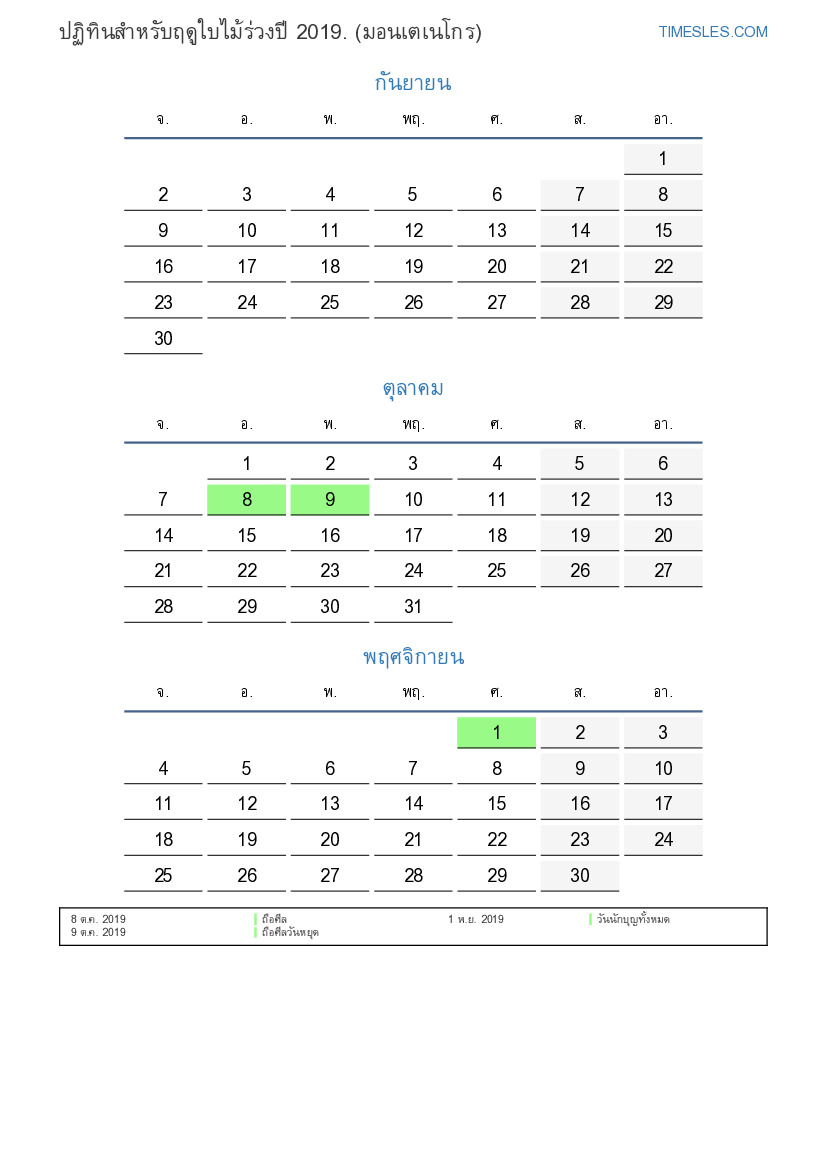 ในฤดูใบไม้ร่วง 2019 ในมอนเตเนโกรมีวันหยุด 4 วันหยุดและวันหยุด ฤดูใบไม้ร่วงปี 2019 เริ่มในวันอาทิตย์และสิ้นสุดวันเสาร์