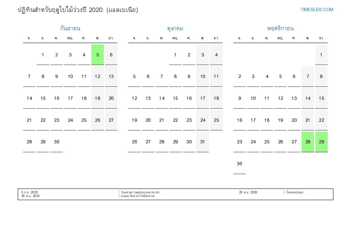 ปฏิทินสำหรับฤดูใบไม้ร่วงปี 2020 สำหรับแอลเบเนีย