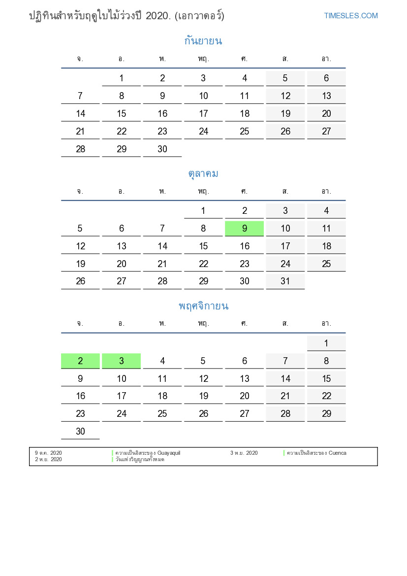 ปฏิทินสำหรับฤดูใบไม้ร่วงปี 2020 สำหรับเอกวาดอร์