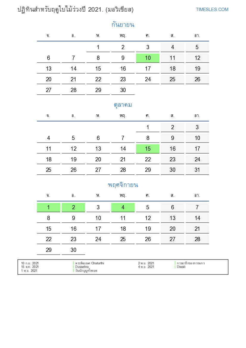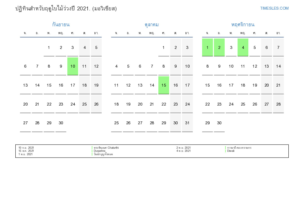 ปฏิทินสำหรับฤดูใบไม้ร่วงปี 2021 สำหรับมอริเชียส