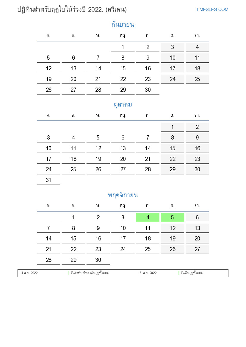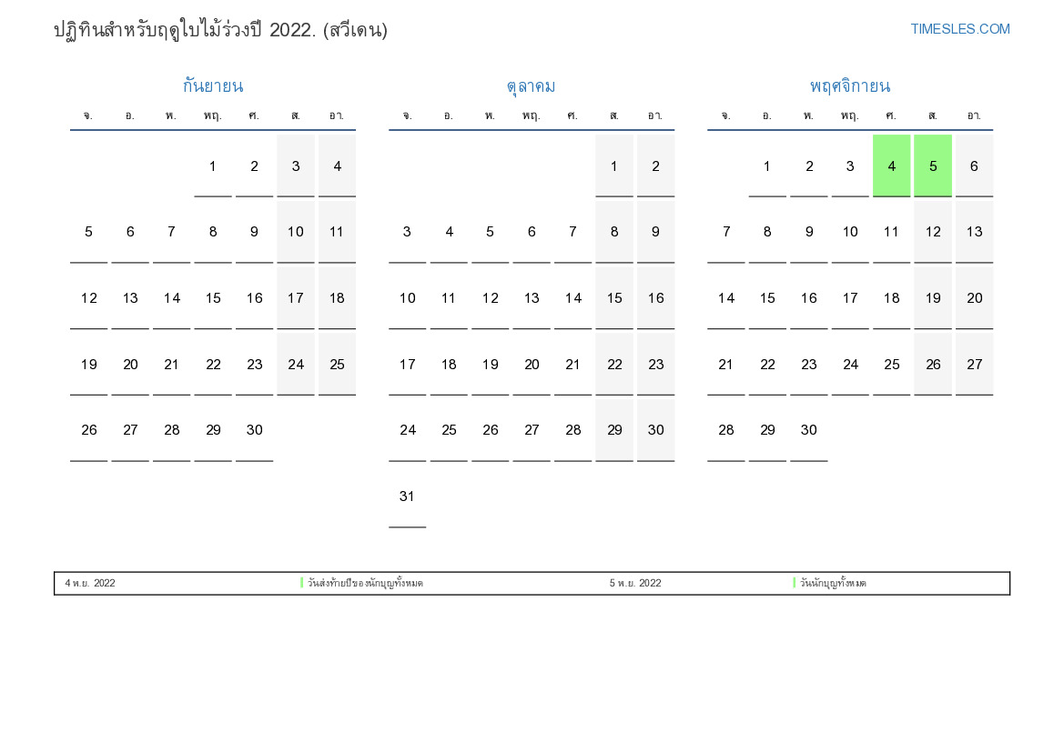 ปฏิทินสำหรับฤดูใบไม้ร่วงปี 2022 สำหรับสวีเดน