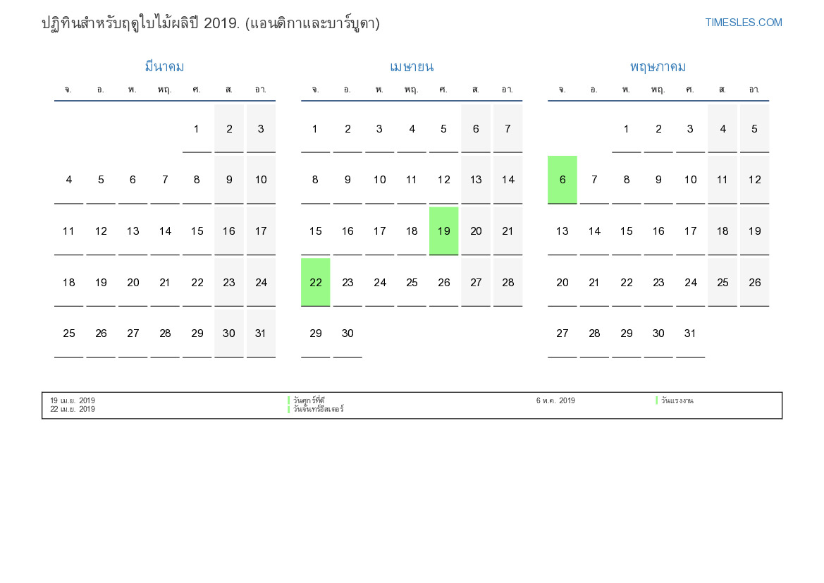 ปฏิทินสำหรับฤดูใบไม้ผลิปี 2019 สำหรับแอนติกาและบาร์บูดา