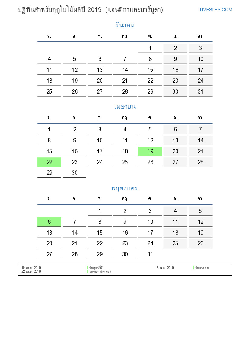 ปฏิทินวันหยุดและวันหยุดสุดสัปดาห์สำหรับฤดูใบไม้ผลิปี 2019 สำหรับแอนติกาและบาร์บูดา