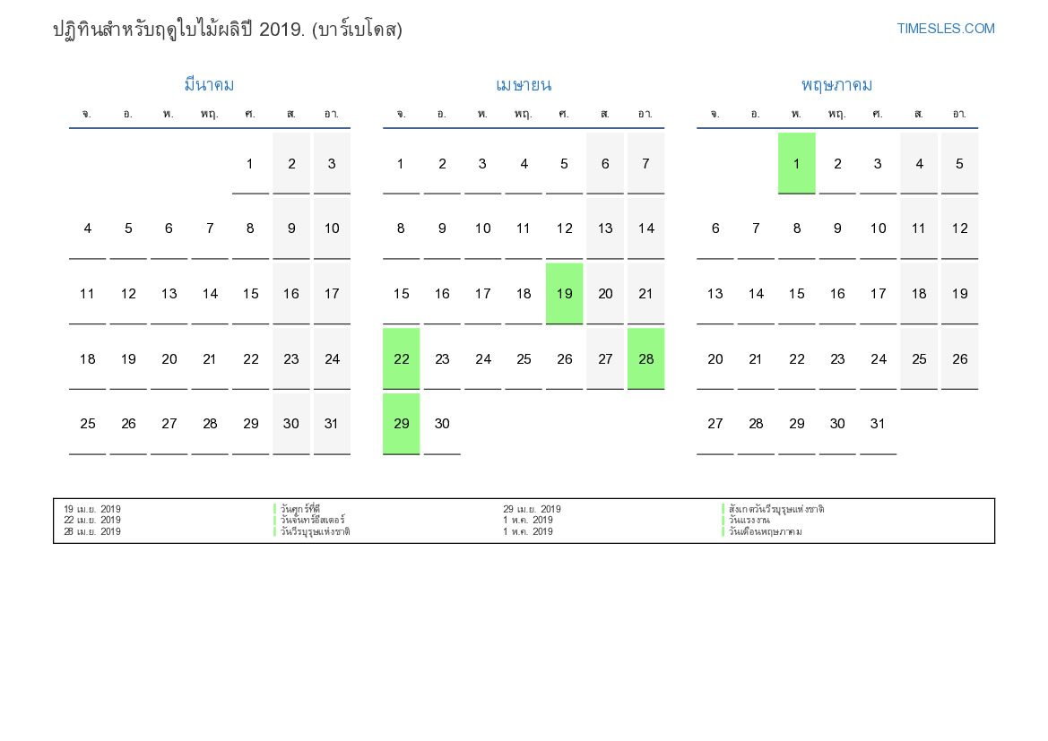 ปฏิทินวันหยุดและวันหยุดสุดสัปดาห์สำหรับฤดูใบไม้ผลิปี 2019 สำหรับบาร์เบโดส