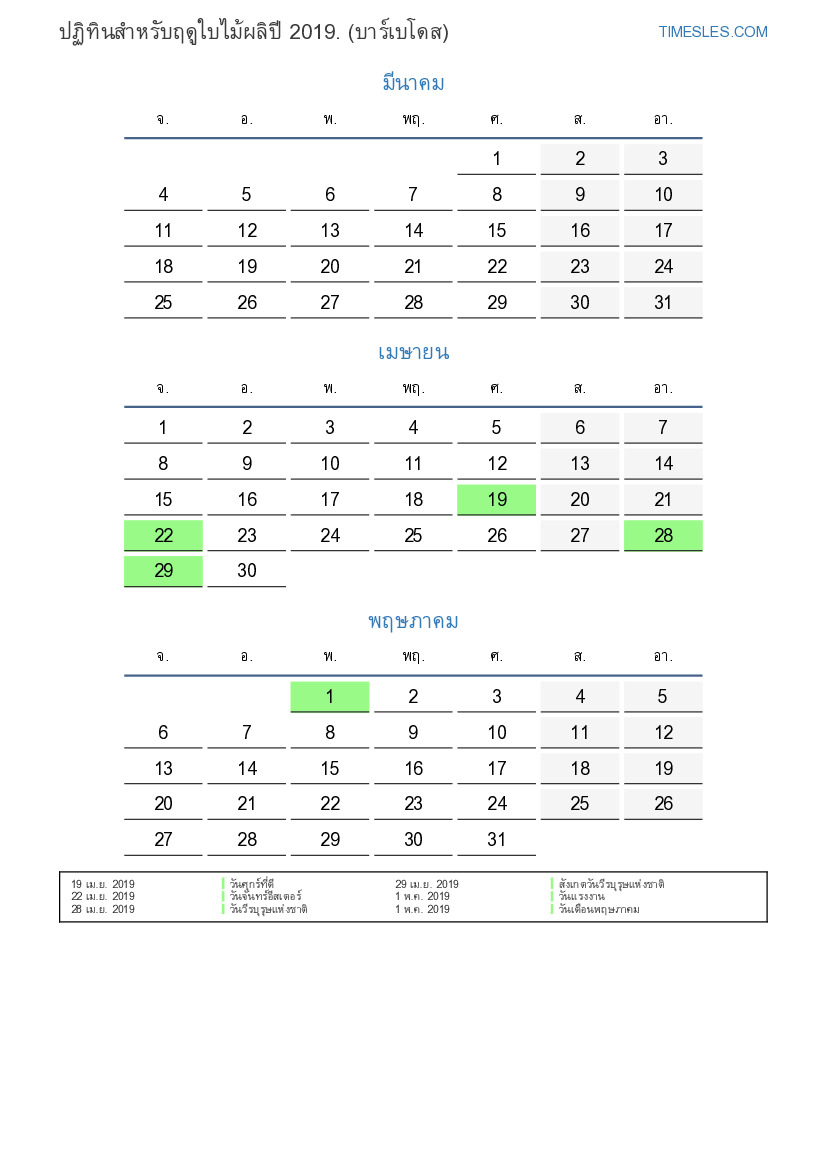 ดาวน์โหลดและพิมพ์ปฏิทิน PDF พร้อมวันหยุดและวันหยุดสุดสัปดาห์สำหรับฤดูใบไม้ผลิปี 2019 สำหรับบาร์เบโดส
