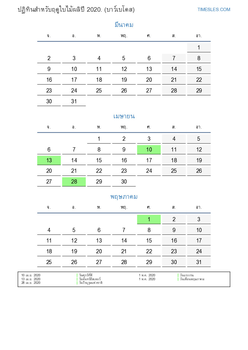 ดาวน์โหลดและพิมพ์ปฏิทิน PDF พร้อมวันหยุดและวันหยุดสุดสัปดาห์สำหรับฤดูใบไม้ผลิปี 2020 สำหรับบาร์เบโดส