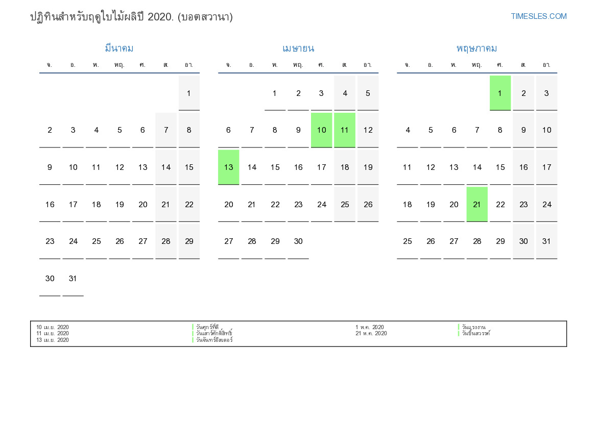 ปฏิทินวันหยุดและวันหยุดสุดสัปดาห์สำหรับฤดูใบไม้ผลิปี 2020 สำหรับบอตสวานา