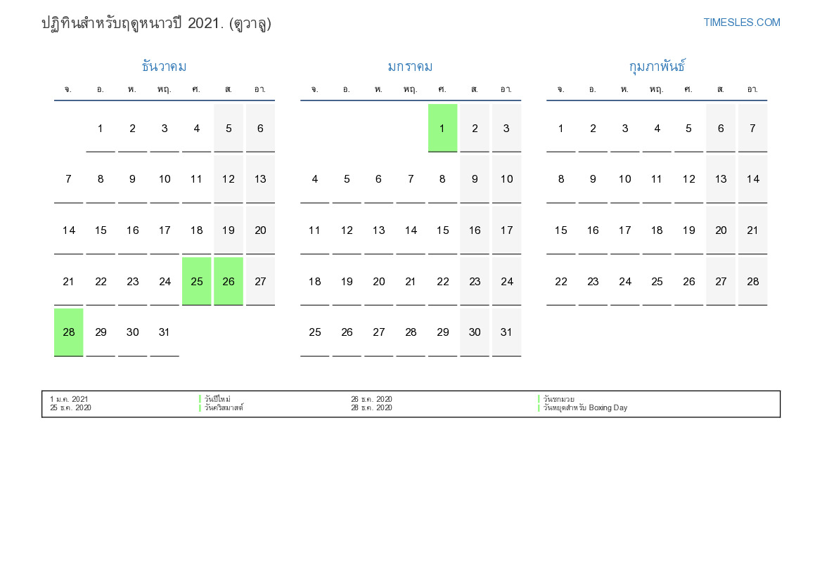 ปฏิทินแนวนอนโดยไม่มีวันหยุด