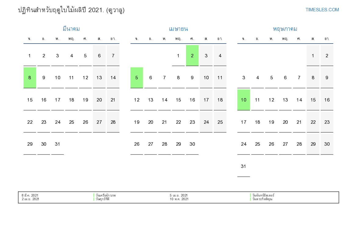 ปฏิทินวันหยุดและวันหยุดสุดสัปดาห์สำหรับฤดูใบไม้ผลิปี 2021 สำหรับตูวาลู