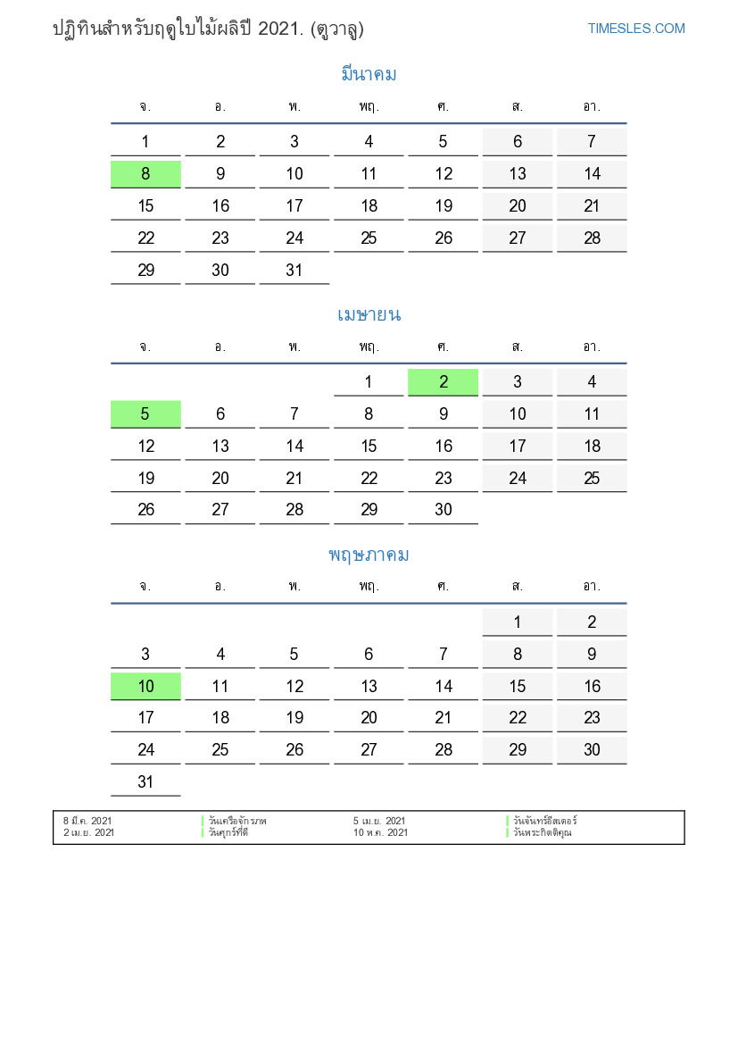 ปฏิทินสำหรับฤดูใบไม้ผลิปี 2021 สำหรับตูวาลู