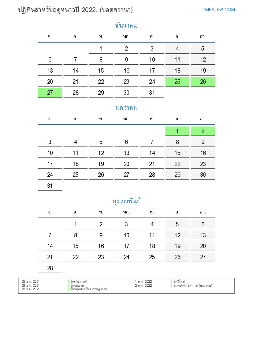 ปฏิทินแนวนอนโดยไม่มีวันหยุด