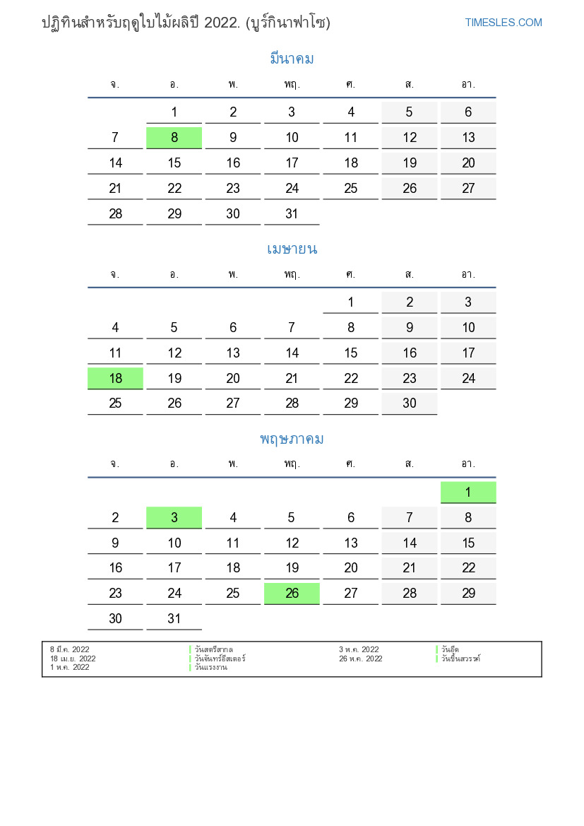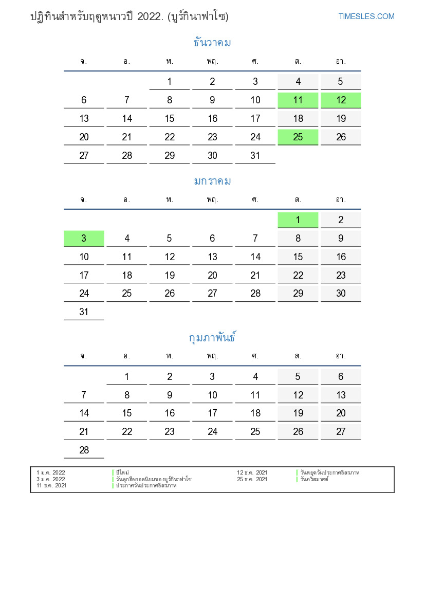 ปฏิทินวันหยุดและวันหยุดสุดสัปดาห์สำหรับฤดูใบไม้ผลิปี 2022 สำหรับบูร์กินาฟาโซ