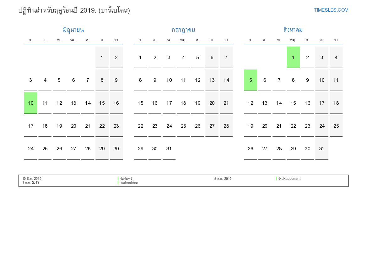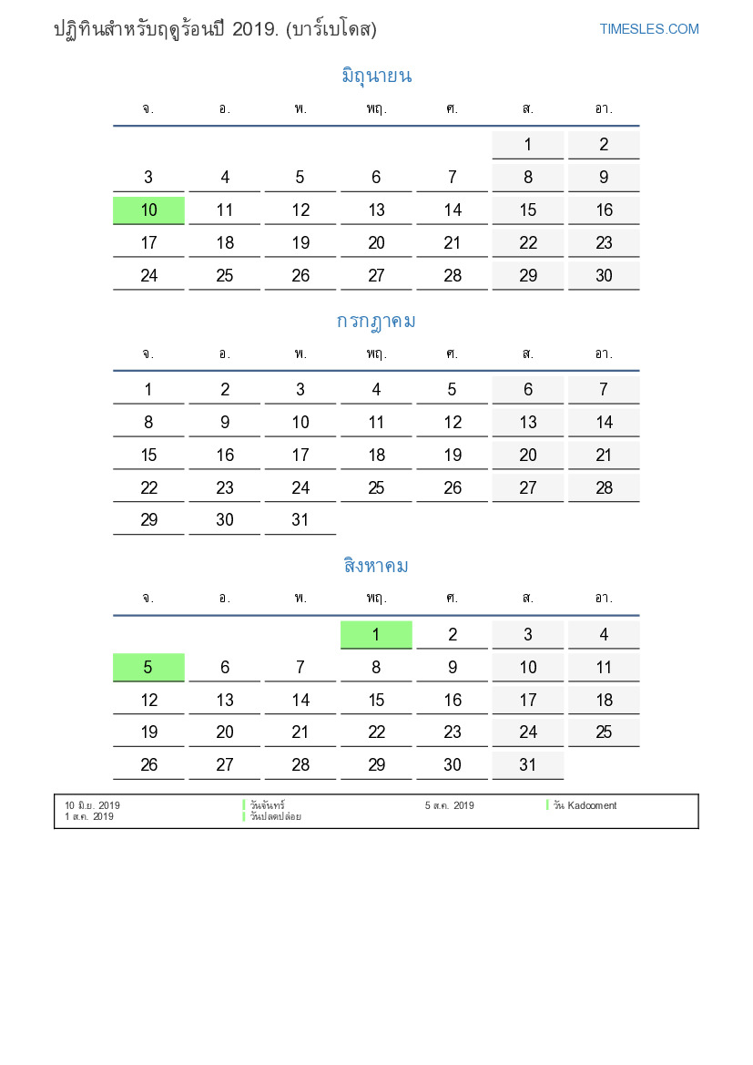 ปฏิทินสำหรับฤดูร้อนปี 2019 สำหรับบาร์เบโดส