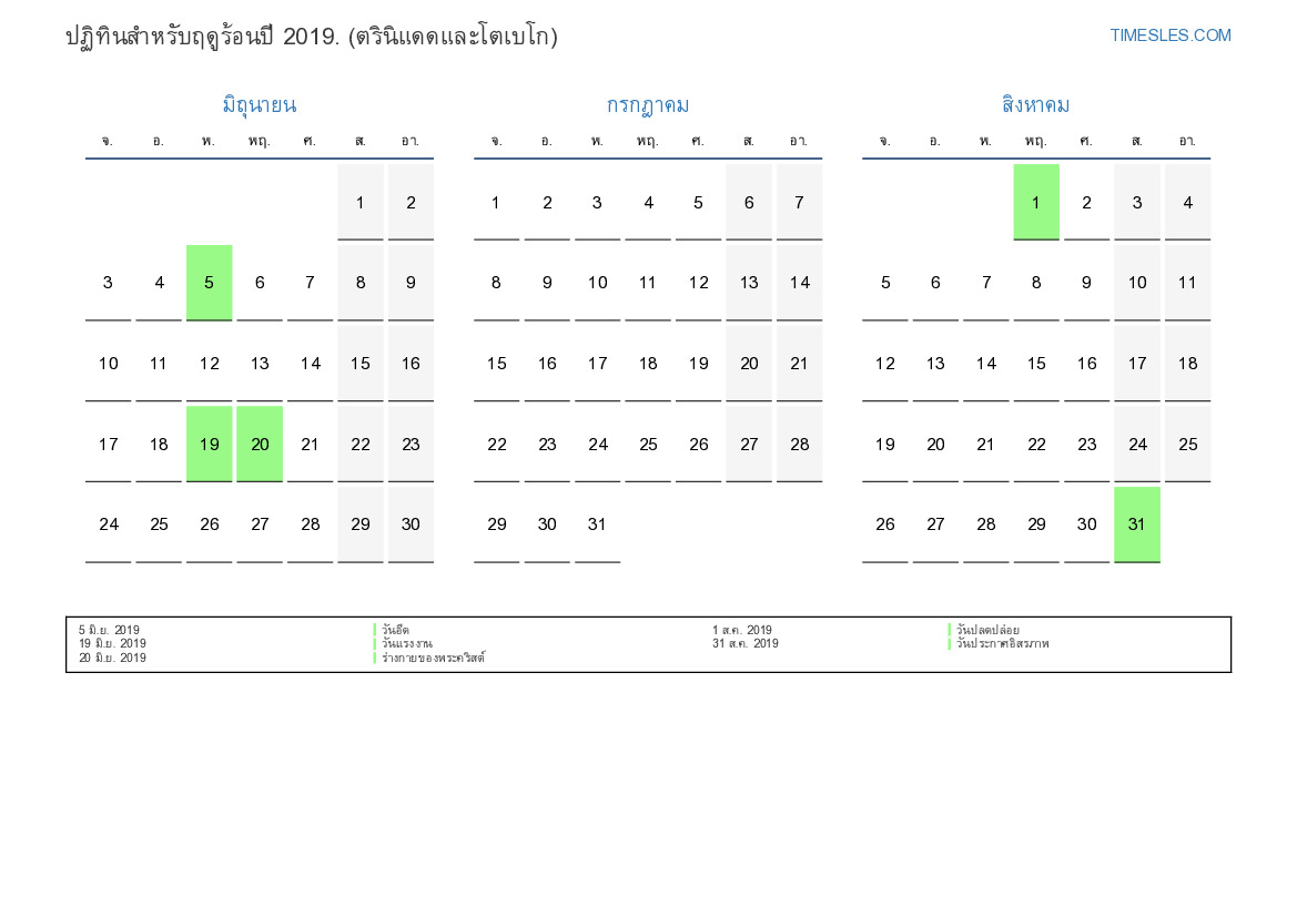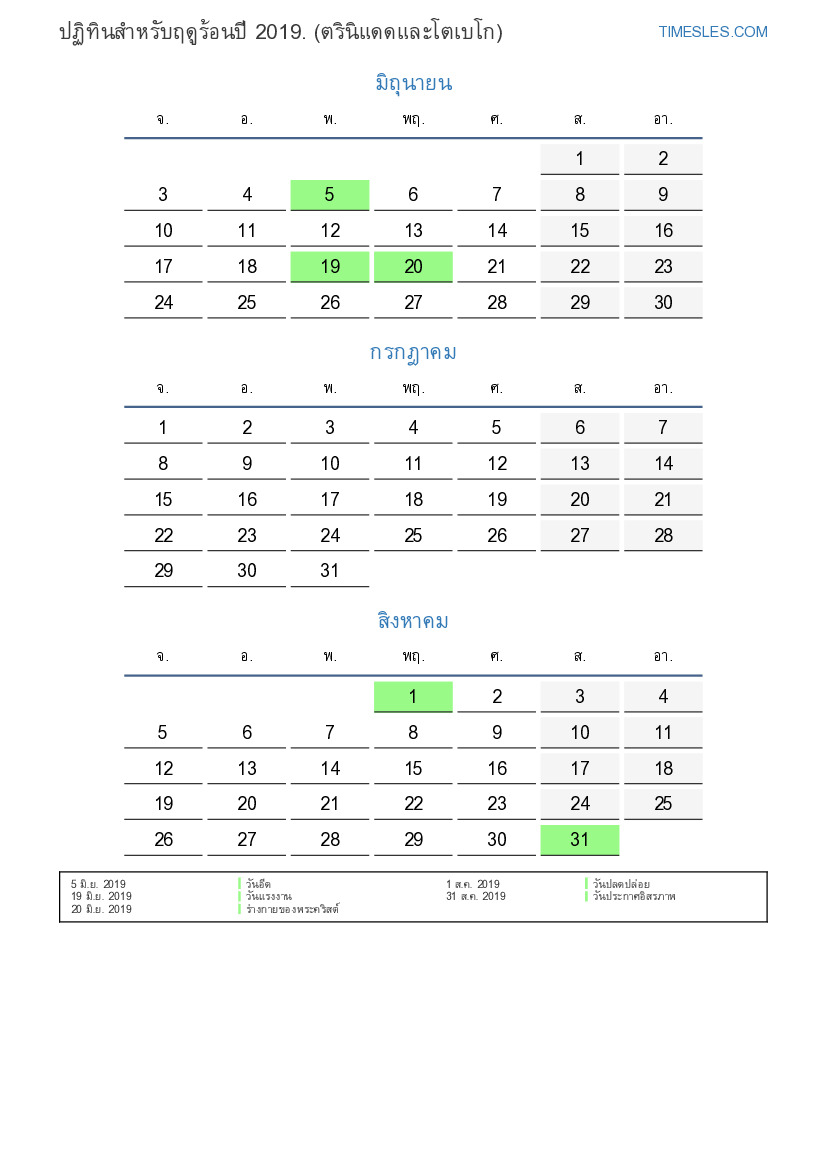 ปฏิทินสำหรับฤดูร้อนปี 2019 สำหรับตรินิแดดและโตเบโก